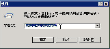 一."開始功能表"-->"執行"-->鍵入"control userpasswords2 "後-->"ENTER"