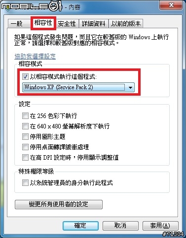 在"相容性"下,將"以相容模式執行這個程式"勾取後,按"確定"關閉