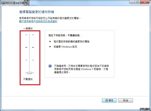 到控制台→使用者帳戶和家庭安全→使用者帳戶→變更使用者帳戶設定將"滑棒"[不要通知],也就是拉到最低
