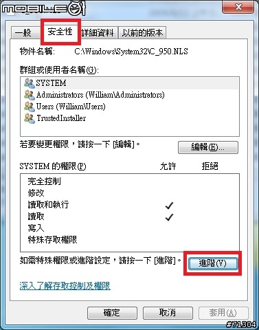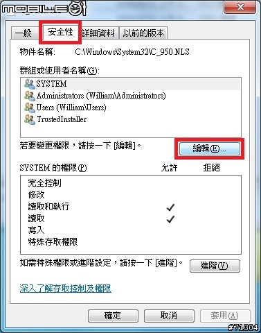 (下列步驟將會變更"C_950.NLS"的檔案屬性,若有需要請自行備份)