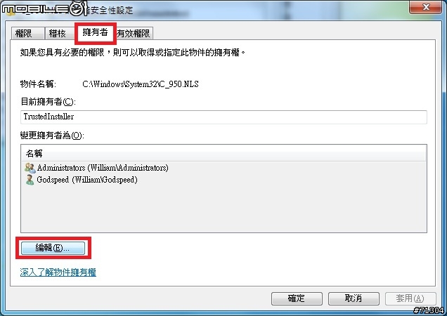 (要確認"目前擁有者"的欄位變成為Adminstrators,不然"目前擁有者"欄位若為TrustedInstaller,按了確定等於白按)