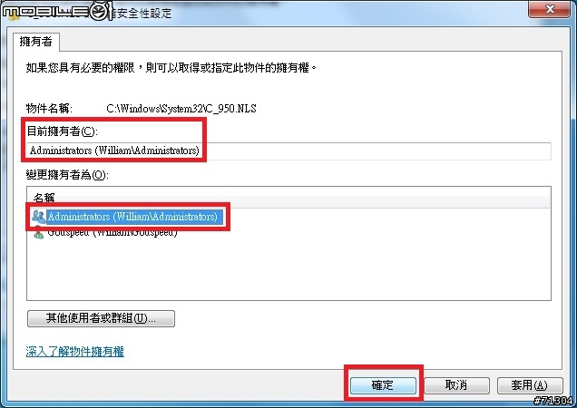 B4.然後將目前擁有者欄位變更為"Adminstrators".....然後按下確定