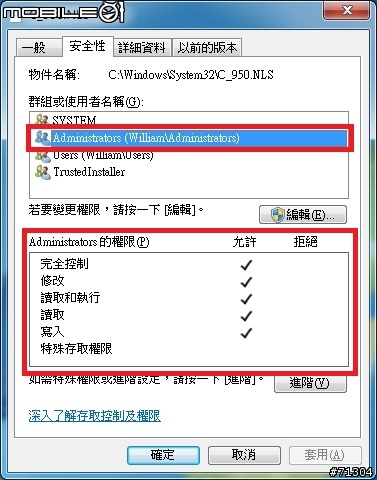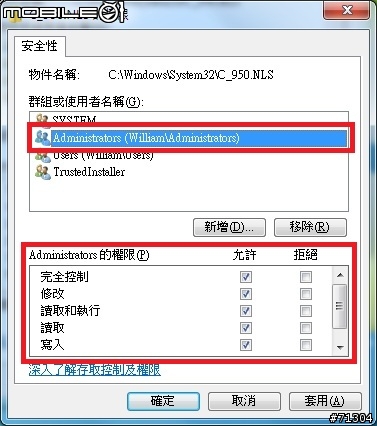 把"Administrators的權限"中的[完全控制]勾取為允許,並按下確定
