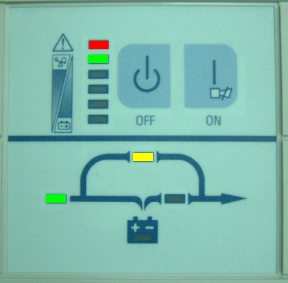 ↓接上電源後,市電指示燈、旁路指示燈、電池及負載指示燈最下面燈號(第1個燈)會亮起;當旁路指示燈亮黃燈,其餘為綠燈,此時 UPS 是處於未開機的狀態。按開機鈕啟動UPS,開機後,旁路指示燈會熄滅,而斷流器指示燈會亮綠燈,這樣的燈號顯示目前 UPS 的運作是正常的。