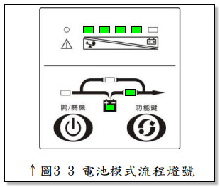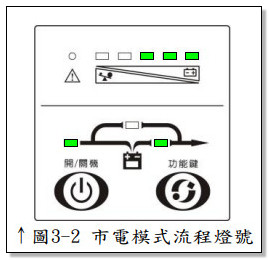 模式;若同時電池指示燈亮,表示市電的電壓或頻率已超出正常範圍,UPS已經工