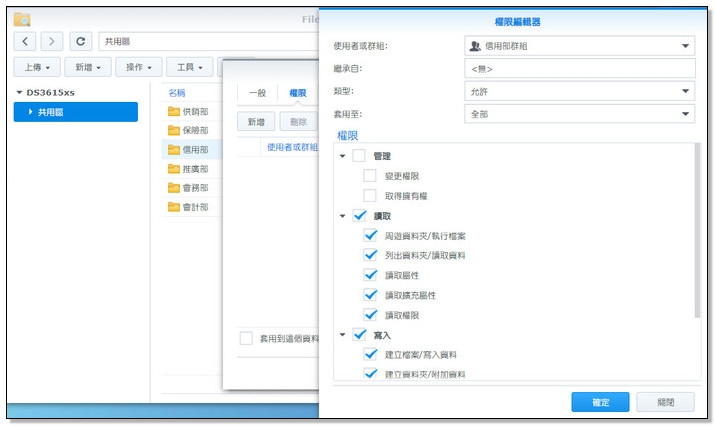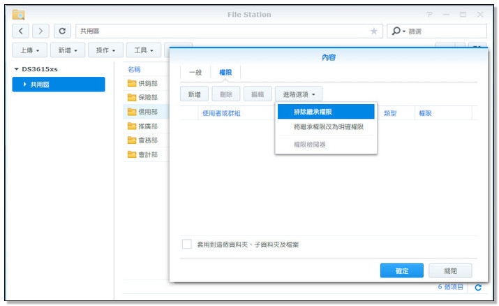 執行【File Station】->【共用區】->【信用部】滑鼠右鍵點擊【內容】->【權限】