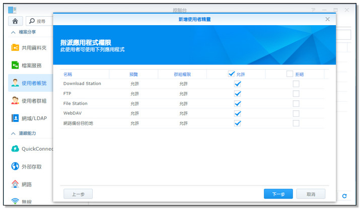 【控制台】->【共用資料夾 】->【共用區】->【編輯】->【權限】頁面