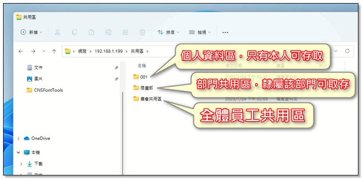 (員工在共用區的子資料夾內具有可讀寫的權限。可以在部門共用區內新增或刪除檔案)